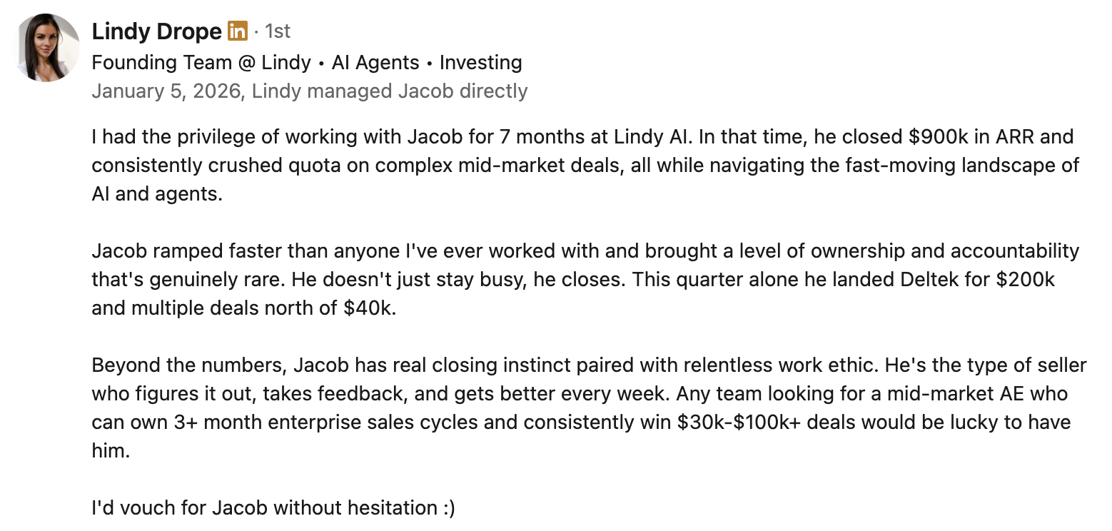 At Lindy, I took those fundamentals and applied them as a founding AE selling AI to technical teams. No playbook, no brand recognition. Just product, process, and persistence. I closed over $900K in net-new business in 8 months.