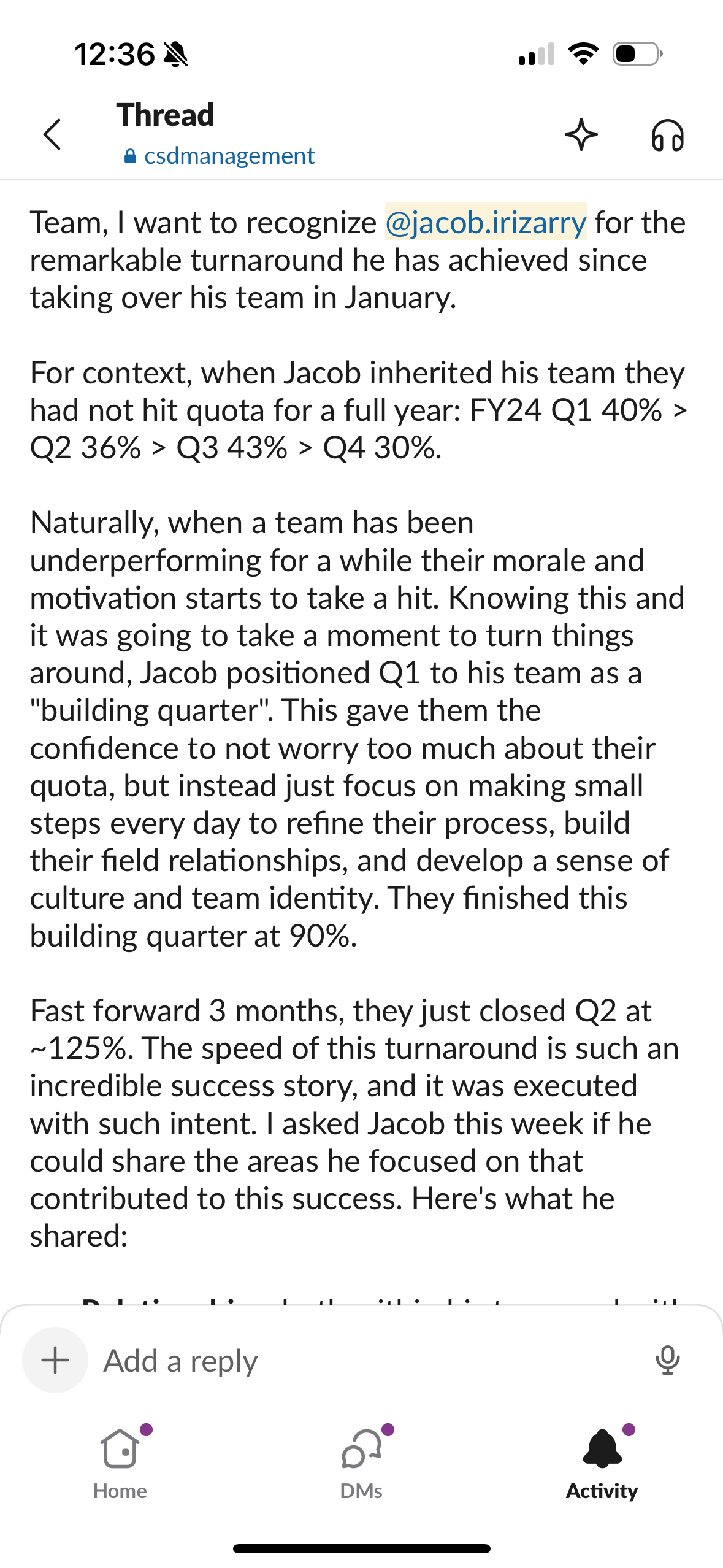 Promoted to SDR manager after 10 months as a top-performing SDR. Inherited a team that hadn't hit 36% quota in over a year—75% of my reps had less than 5 months of experience.